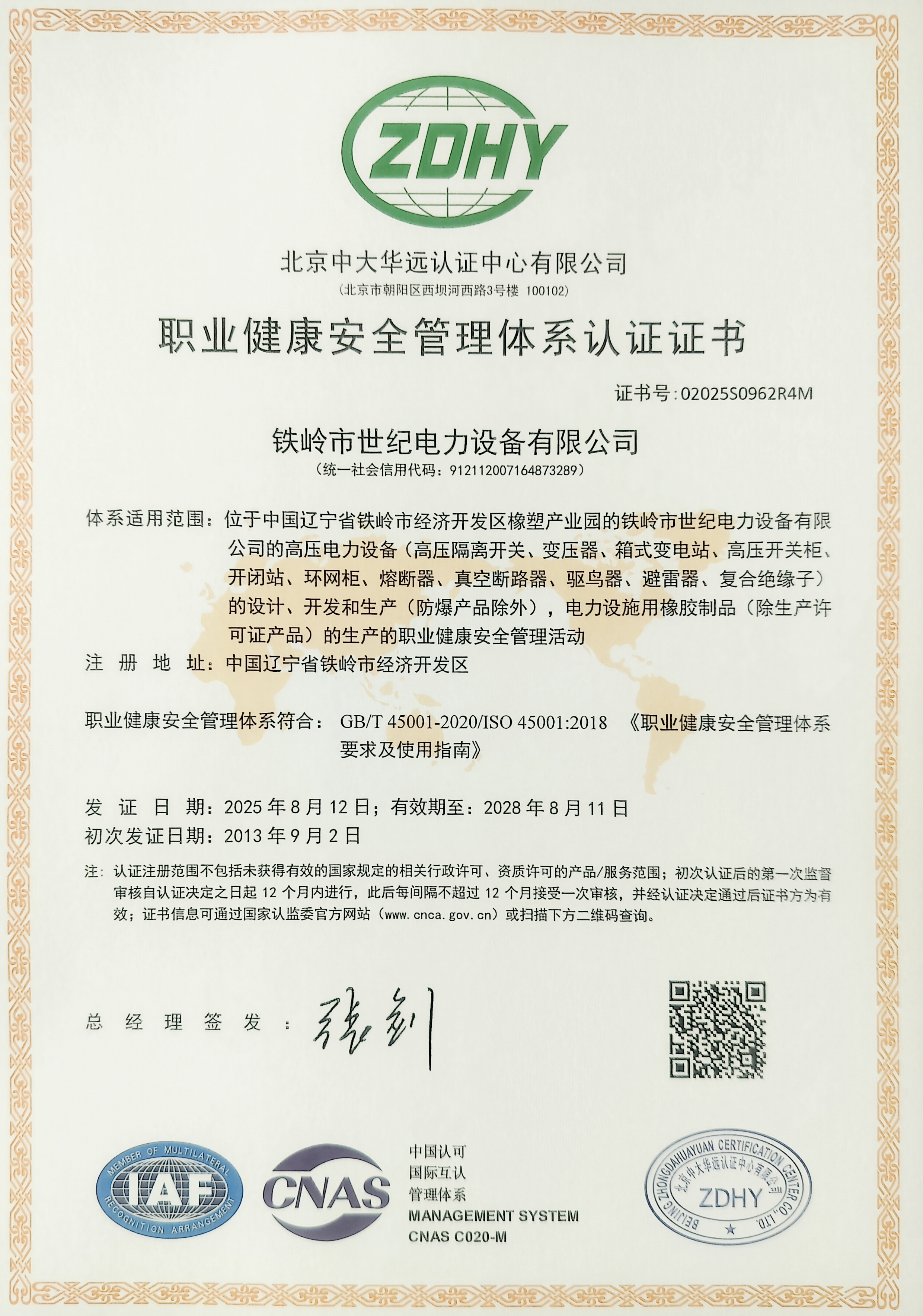 鐵嶺市世紀電力設備有限公司是集科研開發(fā)、生產制造、用戶服務于一體的國家高新技術企業,始建于1999年,位于鐵嶺經濟開發(fā)區,占地面積5萬余平方米,建筑面積2萬余平方米。主要從事國家電網配套戶外高低壓隔離開關、電力電纜、變壓器成套裝置、高低壓開關柜、箱式變電站、絕緣子等產品的研發(fā)、生產和銷售。公司現有國家發(fā)明專利6項、實用新型專利9項,公司通過了ISO9001國際質量管理體系認證、ISO14001環(huán)境管理體系認證和ISO 45001職業健康安全體系認證。